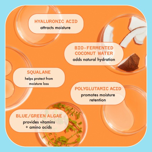 Water/Eau/Aqua, Glycerin, Cetearyl Alcohol, Squalane, Hippophae Rhamnoides (Sea Buckthorn/Argousier) Fruit/Seed Oil, Brassica Campestris (Rapeseed/Colza) Seed Oil, Sesamum Indicum (Sesame/Sésame) Seed Oil, Cocos Nucifera (Coconut/Nuix de Coco) Oil, Sodium Hyaluronate, Polyglutamic Acid, Spirulina Platensis (Blue Green Algae/Algues Bleu-Verte) Extract, Cocos Nucifera (Coconut/Nuix de Coco) Water, Emblica Officinalis (Gooseberry/Groseille à Maquereau) Fruit Extract, Curcuma Longa (Turmeric) Root Extract, Pyrus Malus (Apple/Pomme) Fruit Extract, Leuconostoc/Radish Root Ferment Filtrate, Panthenol, Quaternium-91, Myristyl Myristate, Behentrimonium Chloride*, Ethylhexylglycerin, Phenoxyethanol, Citric Acid, Potassium Sorbate, Sodium Benzoate, Fragrance/Parfum, Benzyl Benzoate, Hydroxycitronellal, Limonene, Citronellol, Coumarin *antistatic agent/agent antistatique